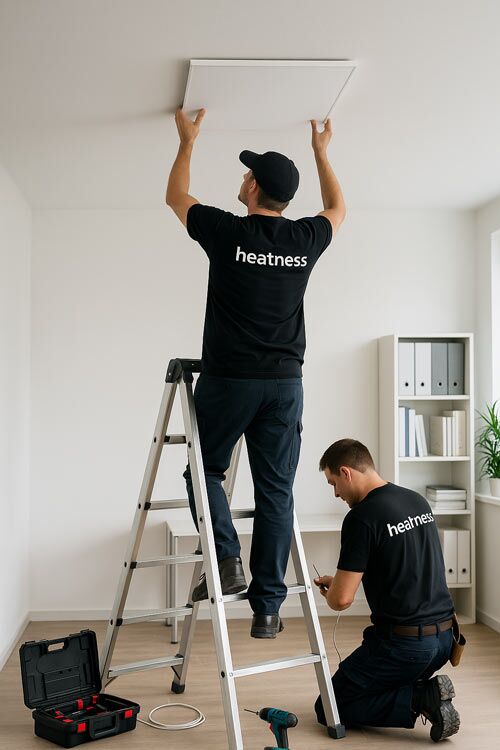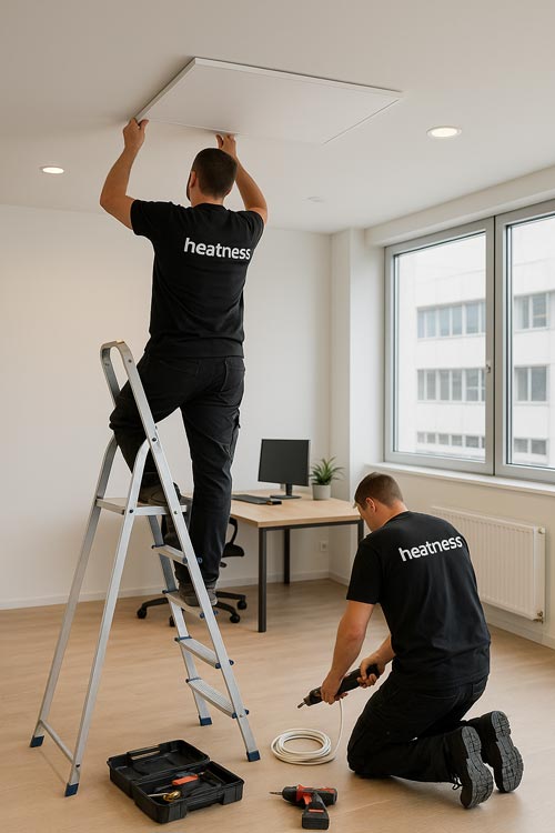 Eine abgehängte Deckenmontage ist bei einer Raumhöhe ab 3 Metern ratsam, da so die Infrarot-C-Strahlen die Materie optimal erreichen, ohne dass Wärme verloren geht. Beim Montieren der abgehängten Variante sollten möglichst zwei Personen gemeinsam arbeiten.