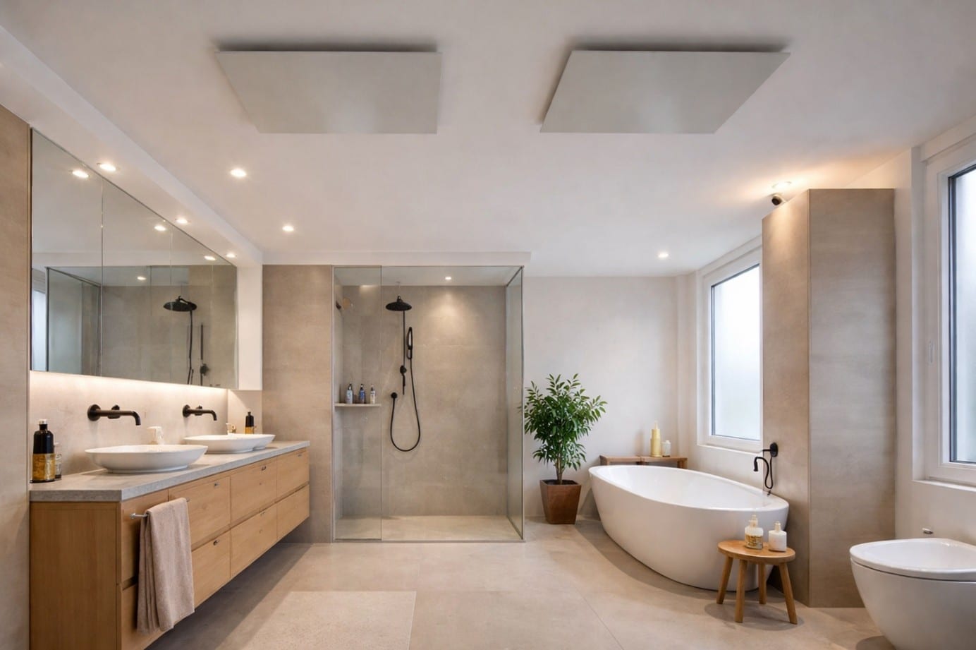 Im Badezimmer braucht es oftmals ein platzsparendes Heizsystem. Was eignet sich besser als die Montage an der Decke? Unsere Infrarotheizung für die Decke sind besonders flach und unauffällig – somit passen sie sich nahtlos dem Badezimmerdesign an.